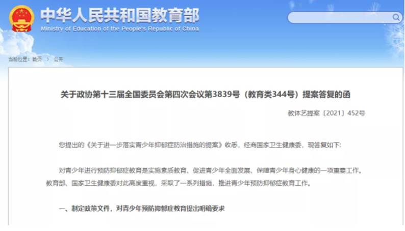 教育部日前对政协《关于进一步落实青少年抑郁症防治措施的提案》进行了答复,其中明确将抑郁症筛查纳入学生健康体检内容,建立学生心理健康档案,评估学生心理健康状况,对测评结果异常的学生给予重点关注。