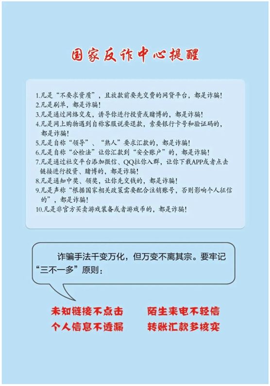 电信网络诈骗手法千变万化,但万变不离其宗,记住“三不一多”原则: