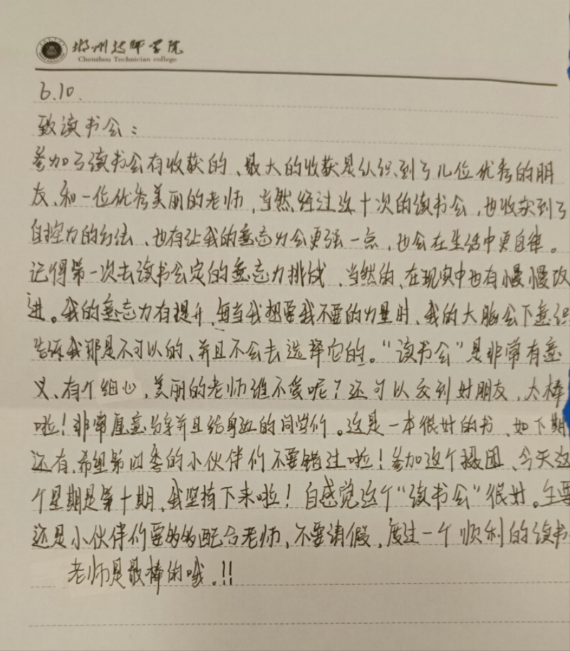 此次活动从3月1日开始招募读书学员,3月14日第一次集中阅读,6月13日正式结束,历时3个月。参加活动的学员在学生工作处雷丽华老师的带领下,通过每周一次,每次阅读一章,3个月共计十一期活动,读完《自控力》一书。在集中阅读分享活动上,同学们热情饱满、积极参与、主动阅读、真诚分享、认真聆听,营造了浓厚的学习氛围,同学们也随着阅读悄然发生着变化,“改掉了熬夜、长时间打游戏、做事拖拉等不良习惯;养成了早起、阅读、运动、少喝饮料,晚自习不闲聊用来专业学习等健康生活与学习的好习惯。”“清晰了自己的目标,提升了自己的自控力。”“对意志力有了全面的新的认识。”“书中的‘10分钟法则’很好用”。